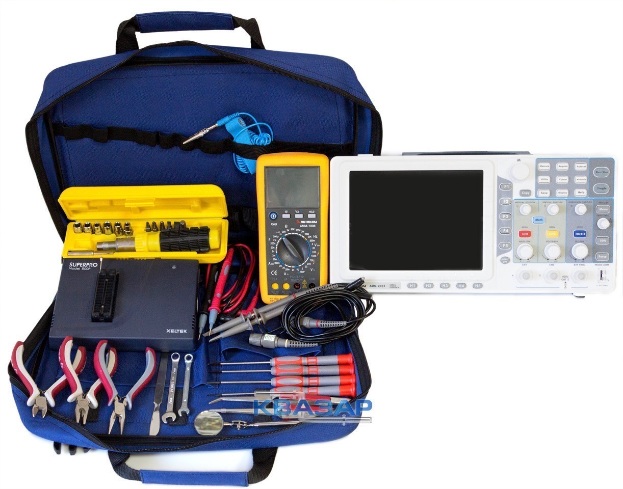 Инструмент, входящий в набор, позволяет произвести сборку и разборку корпуса электронной аппаратуры. А приборы позволяют произвести требуемые контрольные замеры: напряжения, силы тока, сопротивления, частоты, емкости, а также длину, глубину, амплитуду и форму импульса программировать контроллеры в соответствии с функциональной необходимостью.